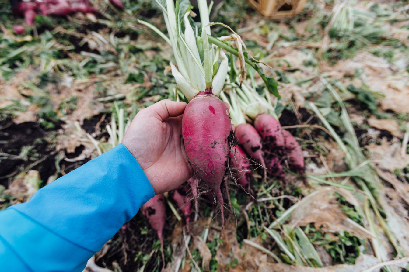 そんな由子さんは、昨年、自分なりのやり方でかぶの栽培を始めたところ、なかなか思うように育たず、今年から勝由さんに一から栽培方法を教えてもらうようになったそうです。肥料の配合等、細かに教わりながら栽培したところ、今年は2アールの畑で約250kgの、形の良い保平かぶを収穫できたのだとか。収穫時、畑にお子さんを連れて来て作業をすることもあるそうです。