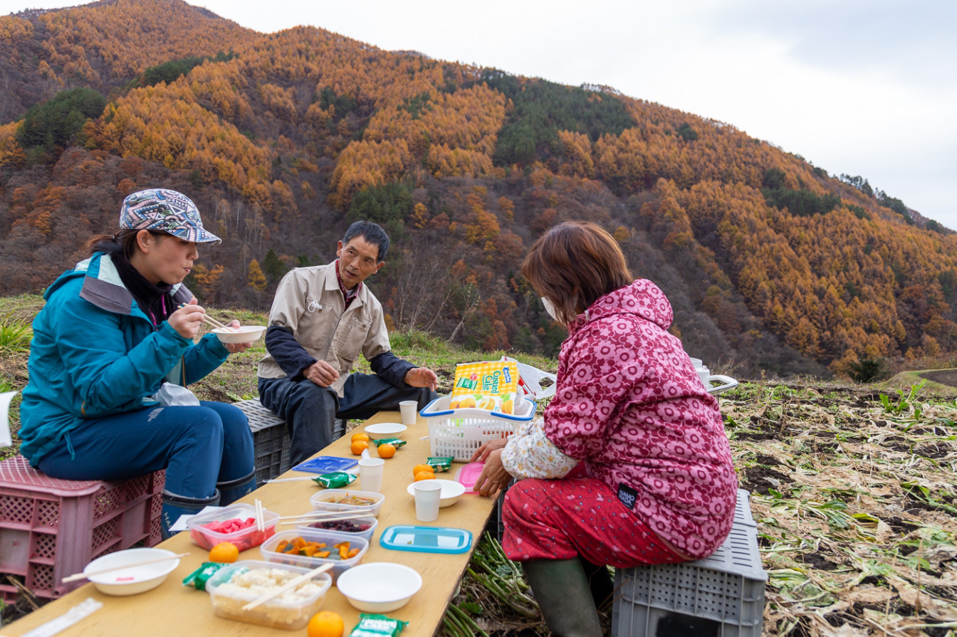 誘われるままに、畑の脇に用意されたテーブルへと移動すると、美喜子さんお手製の保平かぶの甘酢漬けのほか、さまざまなお茶うけが並んでいました。保平かぶの甘酢漬けは、甘みが際立ち、またしゃきっとした食感も良く、いくらでも食べ進めてしまいそうになります。ふと辺りを見渡すと、空は青く、山々に囲まれて、畑が段々と続き……、本当にのどか。こんな風に、畑作業+お茶タイムが奈川のあちこちで日々繰り広げられているのだろうなと思うと、ほっこりとした気持ちになります。